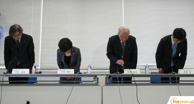 冒頭、頭を下げる理化学研究所の野依良治理事長(右から2人目)ら