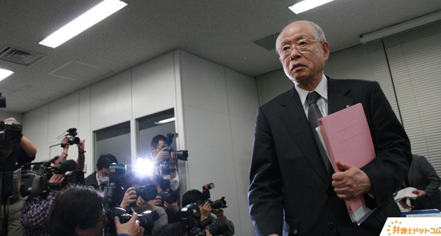 会見場から引きあげる野依理事長