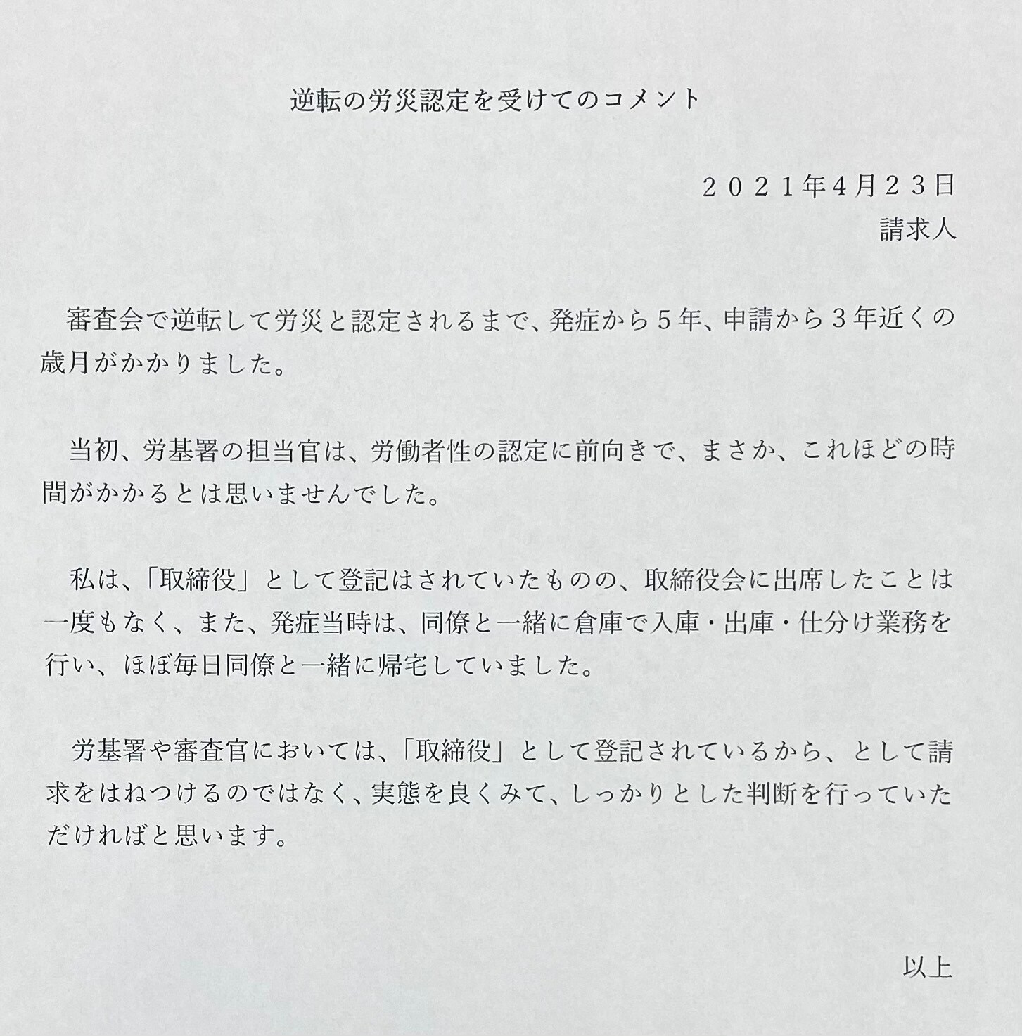 男性は2017年7月に労災を申請したが、「取締役」のため、第一ラウンドの労基署、第二ラウンドの審査請求でも「労働者ではない」として、労災は認められなかった。