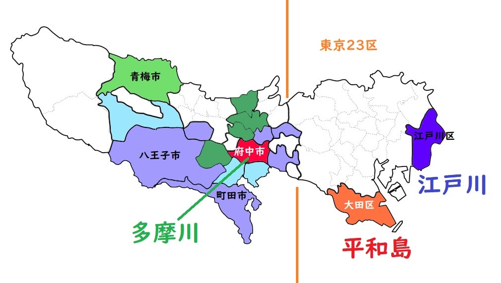 都内の競艇場と施行自治体。赤系は平和島競艇場、緑系が多摩川競艇場、青系が江戸川競艇場に対応。色のグループは同じ施行組合であることを示す(白地図:archestman / PIXTA、着色等は編集部)