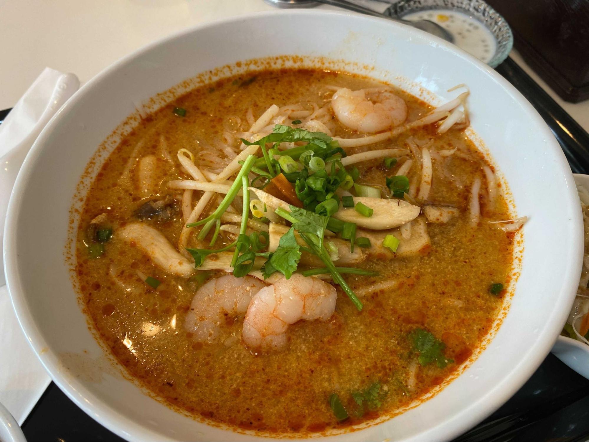 問題の飲食店で実際にランチを食べてみた。プリプリのエビが大量に入ったトムヤムクンラーメンは、辛さも控えめで優しい味わい。何よりセットでついてきたガパオライスが絶品だった。