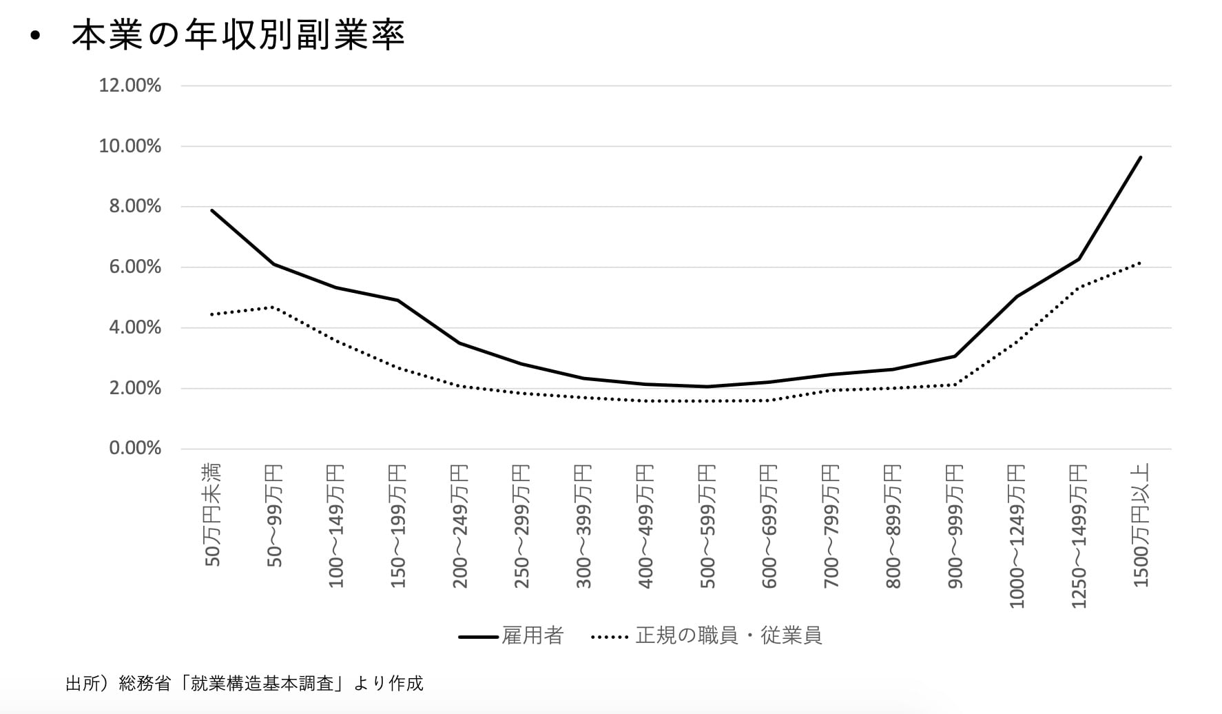 まず副業率が高い層は、年収200万円以下の低所得層と、1000万円以上の富裕層に二極化していた。