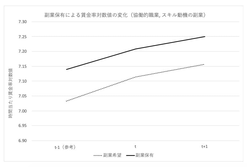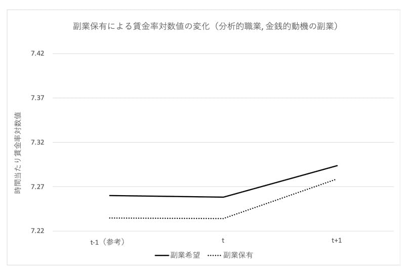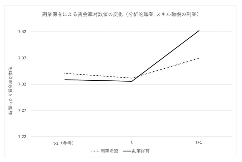 分析自体は複雑なものだが、かなり簡潔に説明すると、協働的職業では、副業保有に関わらず賃金率の伸び方は変わらない。一方で、分析的職業で金銭的動機の場合では、副業を持っても持たなくても違いはわずかだが、分析的職業でスキル動機の場合は明らかに、副業を持つ人の賃金率の伸び方が大きい。