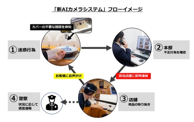 今回の迷惑行為を受けて、くら寿司は3月2日、回転レーンでの迷惑行為を防止する「新AIカメラシステム」の導入を発表した。回転レーン上に設置されたAIカメラによって、レーン上を流れる寿司カバーの不審な開閉を検知すると、本部のアラートがなり、店舗に連絡する仕組みだ。