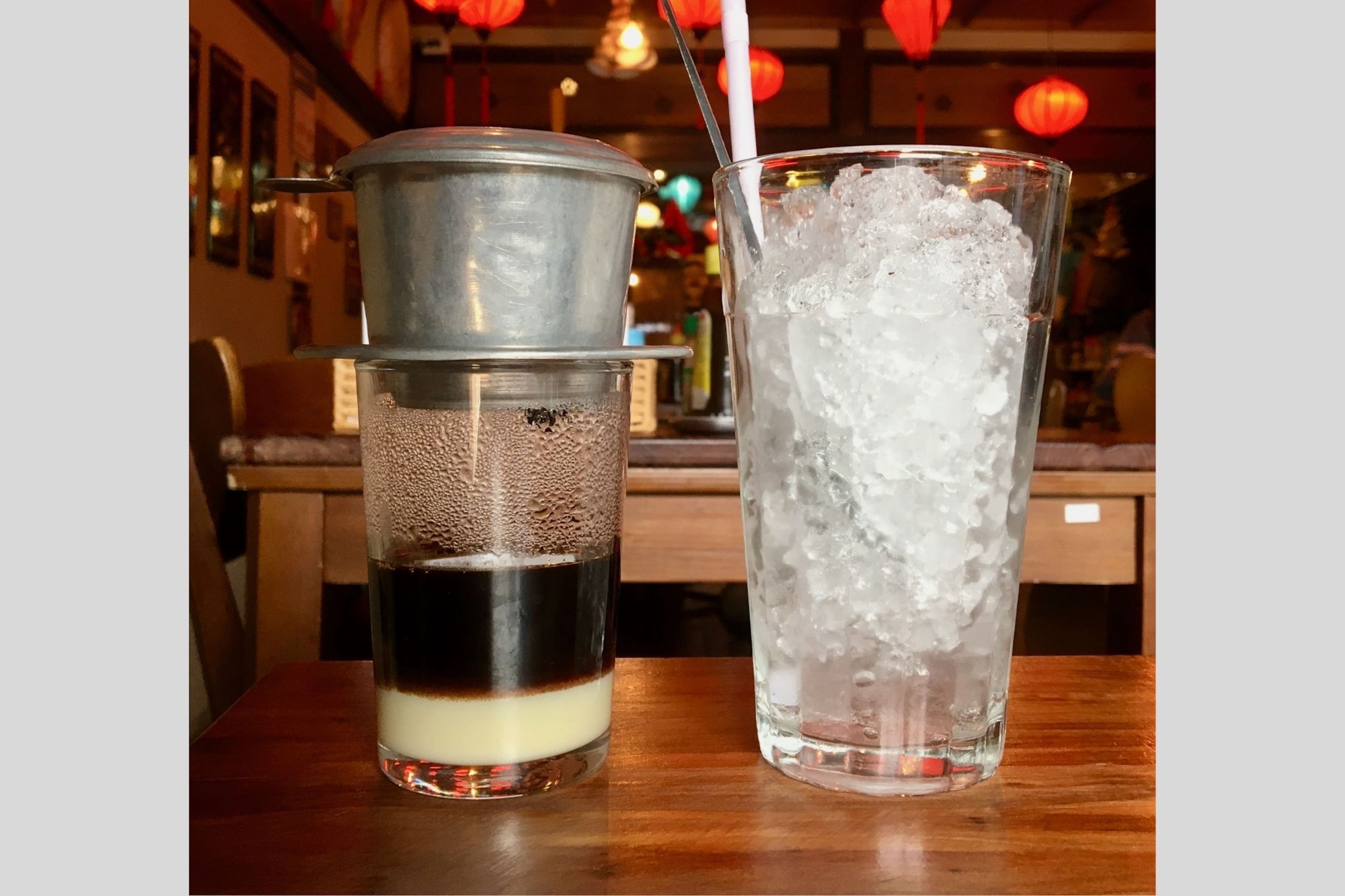 コーヒーはベトナムの朝食に欠かせない。左側のグラスに入ったコーヒーと練乳を混ぜた後、右のグラスに入れて飲む「カフェスアダー」(2022年3月5日、筆者撮影)