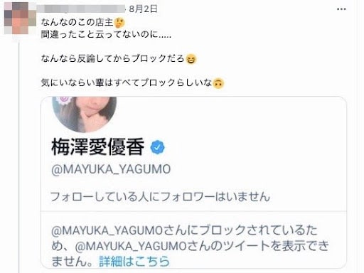 梅澤さんによれば、この男性は自身のツイッターでも、「そもそもバイトAKBだしww」などと、梅澤さんや店を遠回しに否定するような投稿をしてきたという。