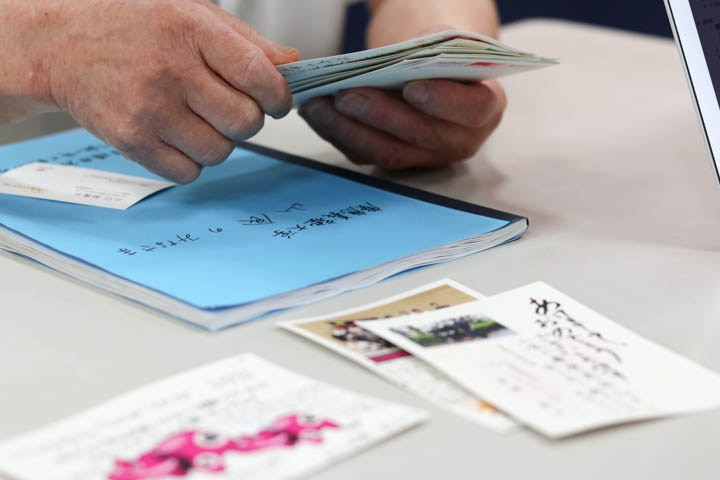 毎年届く沢山の年賀状。青い冊子は横浜初等部の生徒から届けられた応援メッセージが詰まっている