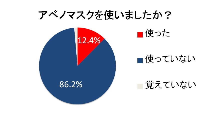 アベノマスクを「使った」という人は12.4%で、「使っていない」が86.2%、「覚えていない」が1.4%だった。